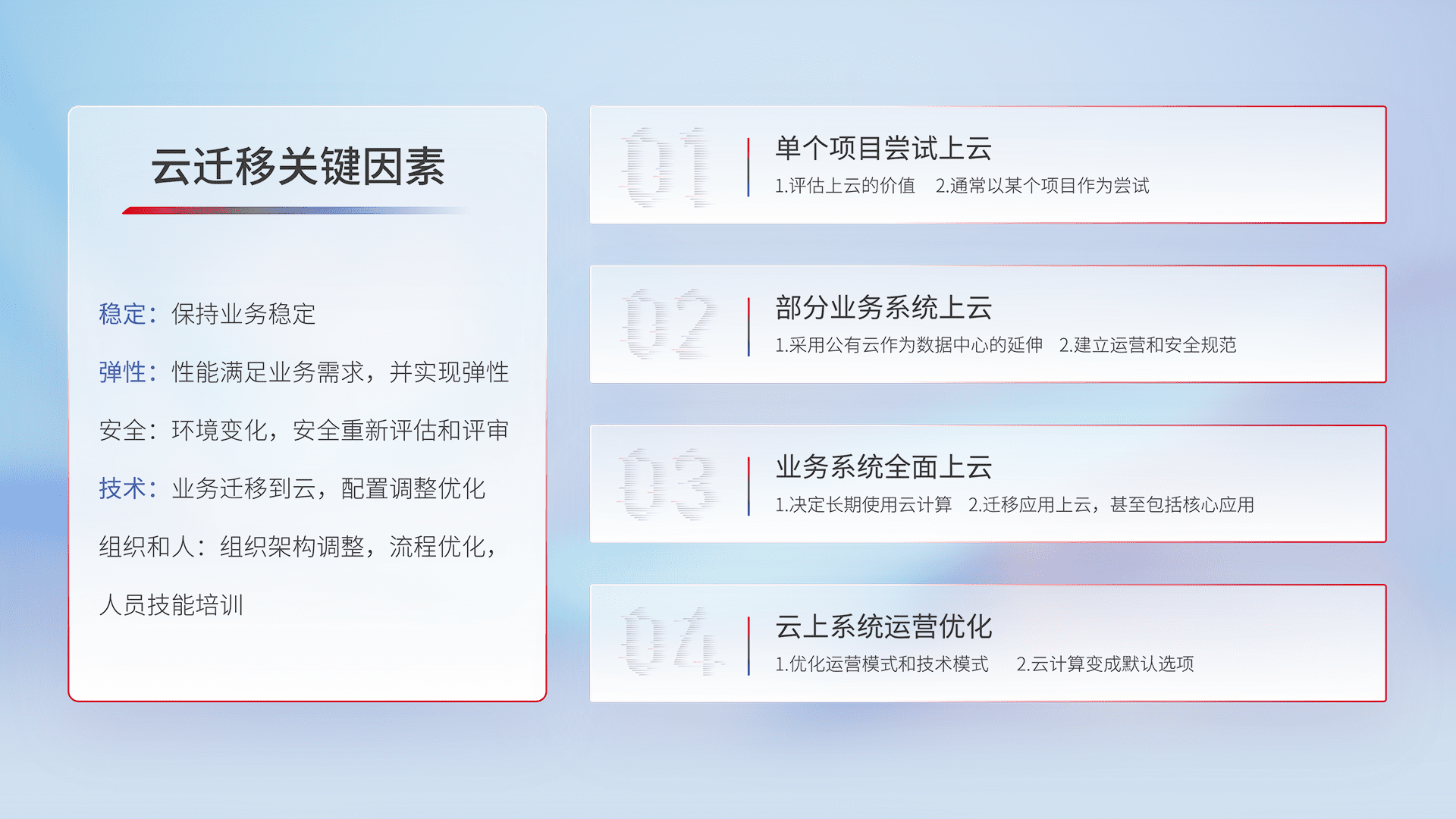 结合实际业务,,,从规划设计、、、云平台选型、、、、云原生改造、、、、数据迁移、、集成交付,,,迁移全过程为客户识别最佳上云路径,,,,做好风险识别管理,,设计网络架构、、身份权限、、、安全审计合规、、操作审计、、、日志审计、、监控告警策略、、多站点容灾设计等,,,,对云上基础设施进行整体规划,,提升IT治理水平,,以满足弹性、、、、高可用、、高性能的需求。。