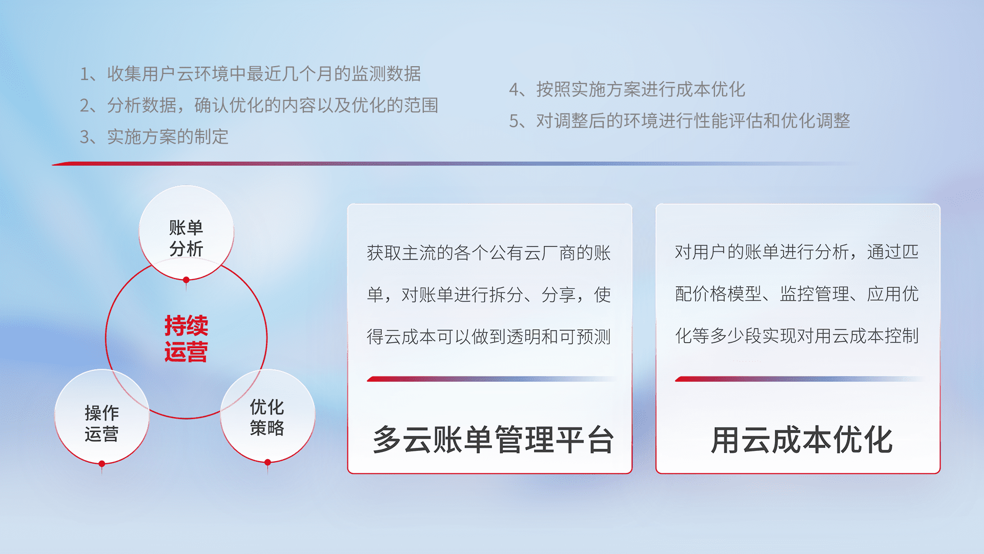 通过多云纳管,,,以统一的资源数据模型把客户的云资源进行抽象和封装,,进而实现对多云资源的统一操作,,,保障云资源管理的可靠性、、、稳定性与可用性。。量身定制化运维内容,,,,配置、、、开发运维、、、、补丁管理、、备份、、、监控、、、认证和访问管理、、、、审计和日常巡检等,,,,保障在用云过程中的可靠度,,,稳定度以及高可用率。。。。